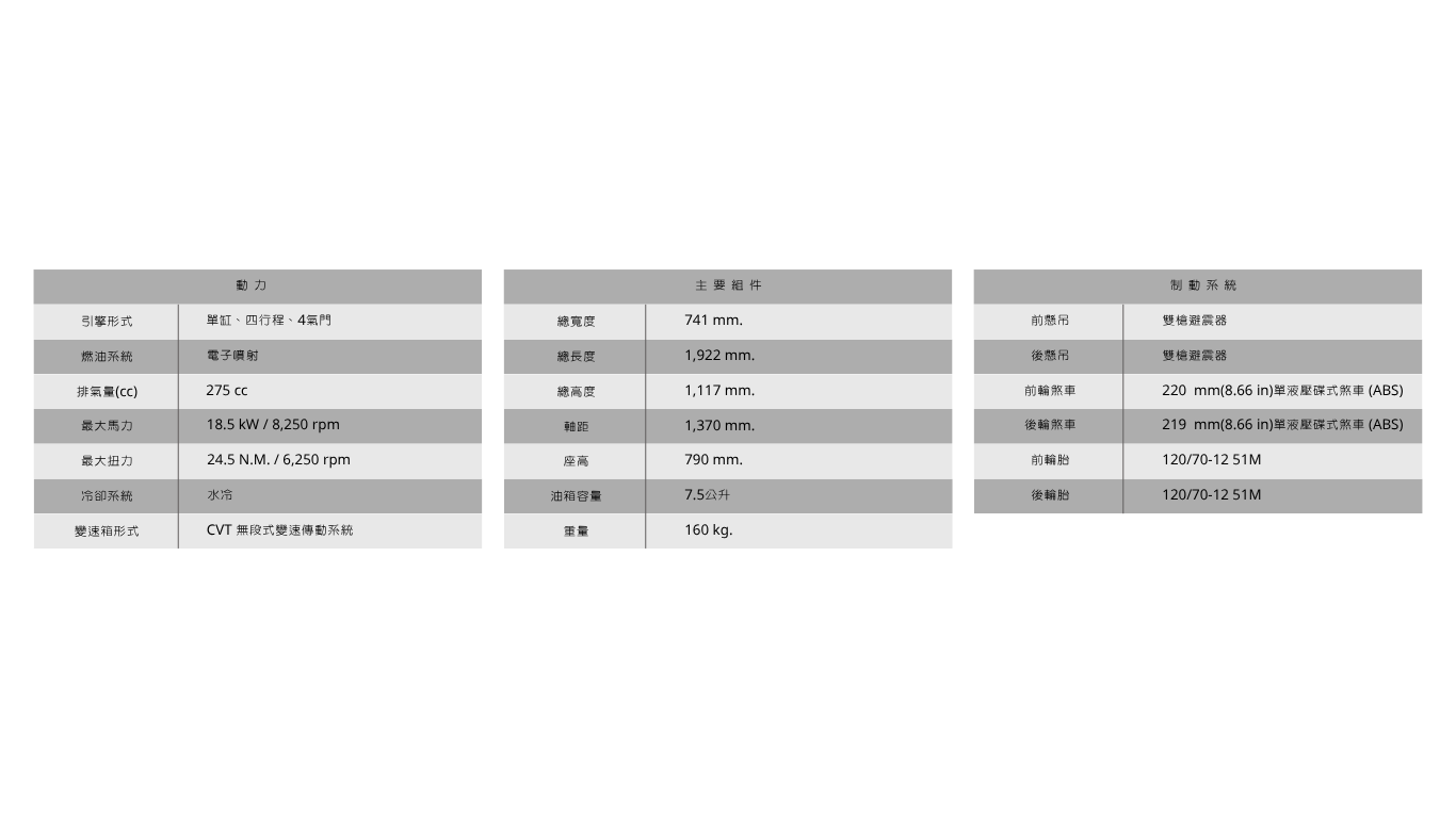 • 前輪煞車:220 mm (8.66 in) 單液壓碟式煞車 (ABS)